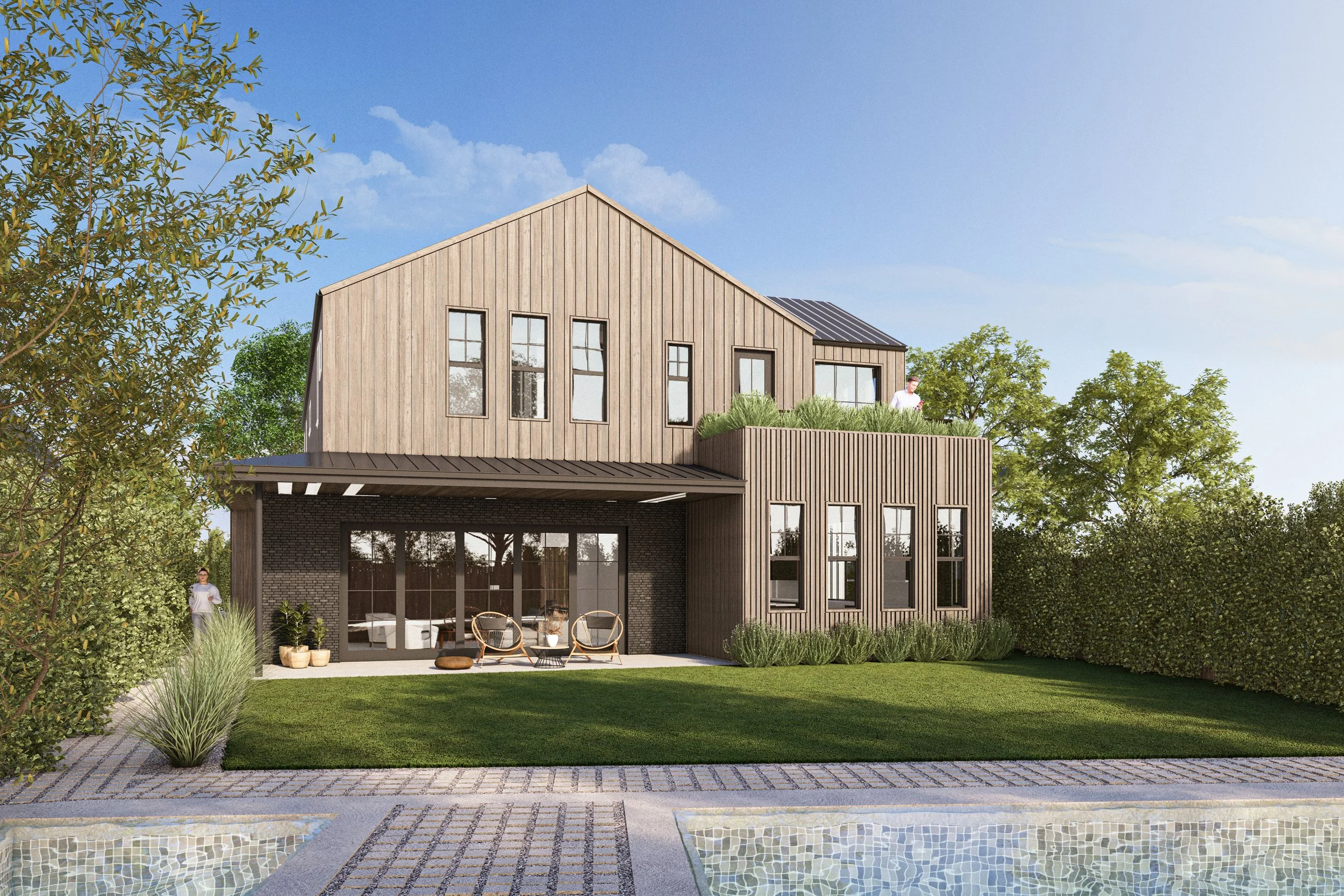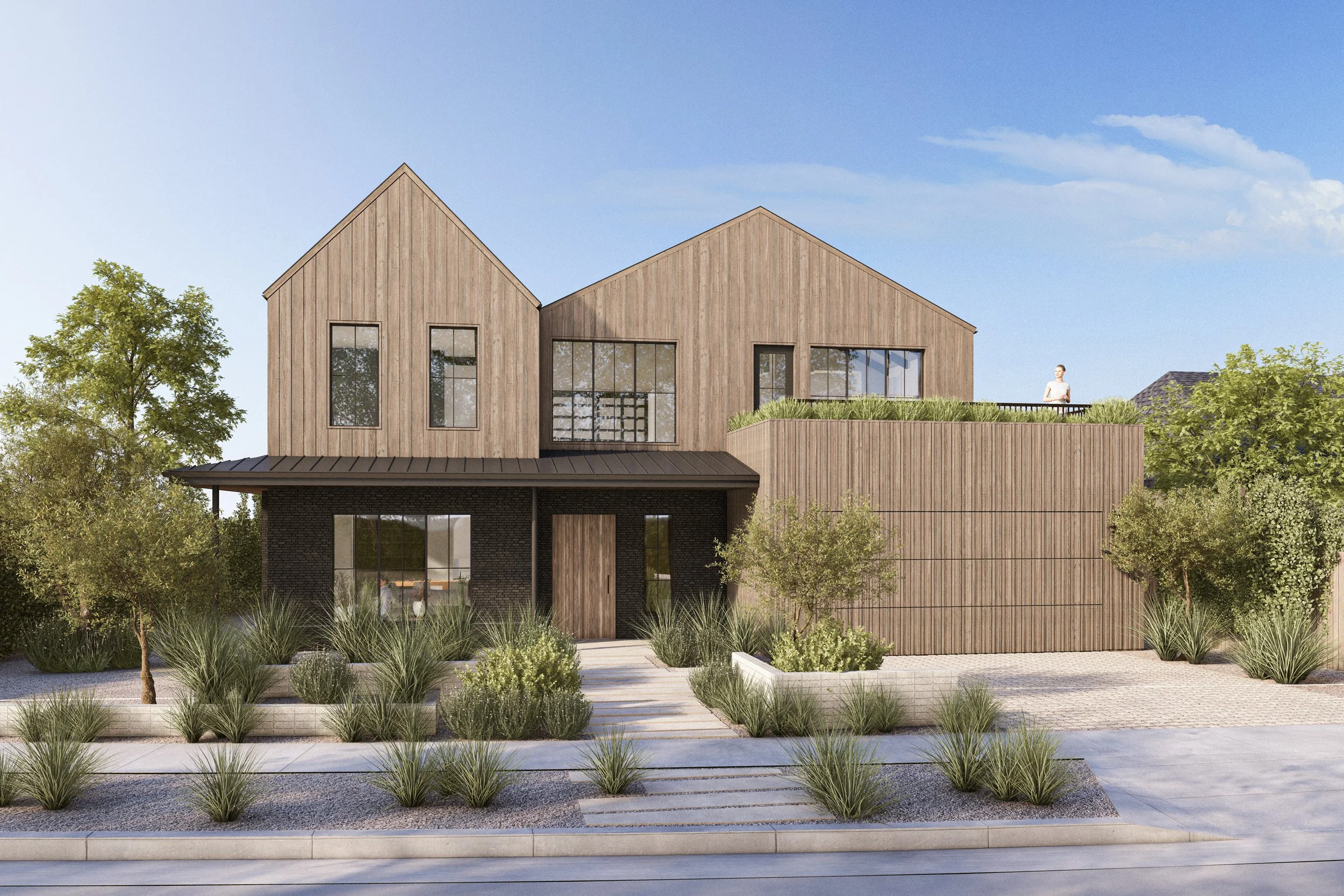 Perched atop a scenic bluff in the Pacific Palisades, this fire rebuild balances memory, function, and resilience. The home recalls its predecessor by maintaining the classic silhouette of the original pitched roofs but breathes new life into the structure through updated layouts and improved spatial flow. To help address the unique challenges of a fire rebuild, the home is constructed using a robust selection of fire-resistant, sustainable materials—including engineered composite woods, brick, and metal—implemented in a muted color palette that emphasizes rich textures and visual depth.